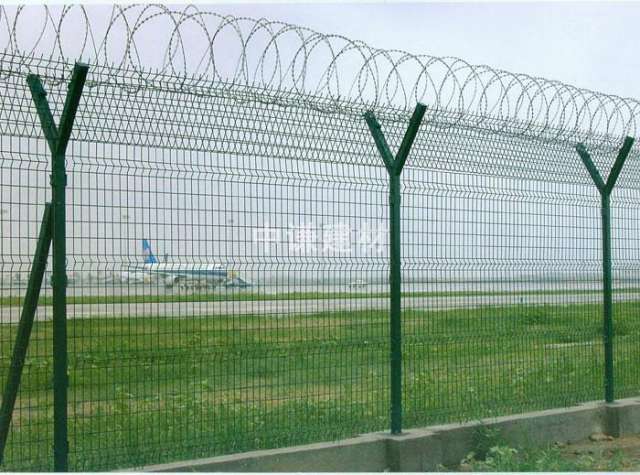 機場護欄網又稱機場圍欄網、機場隔離網、Y型安全防御護網,由Y型支架立拄,加強型焊接片網,網片中帶有Y型加強筋可增強護欄網的抗沖擊力。安全防盜連接件和熱鍍鋅刀片或者刺繩網組成,是強度和安全防御性級別很高的圍界護欄網產品之一。